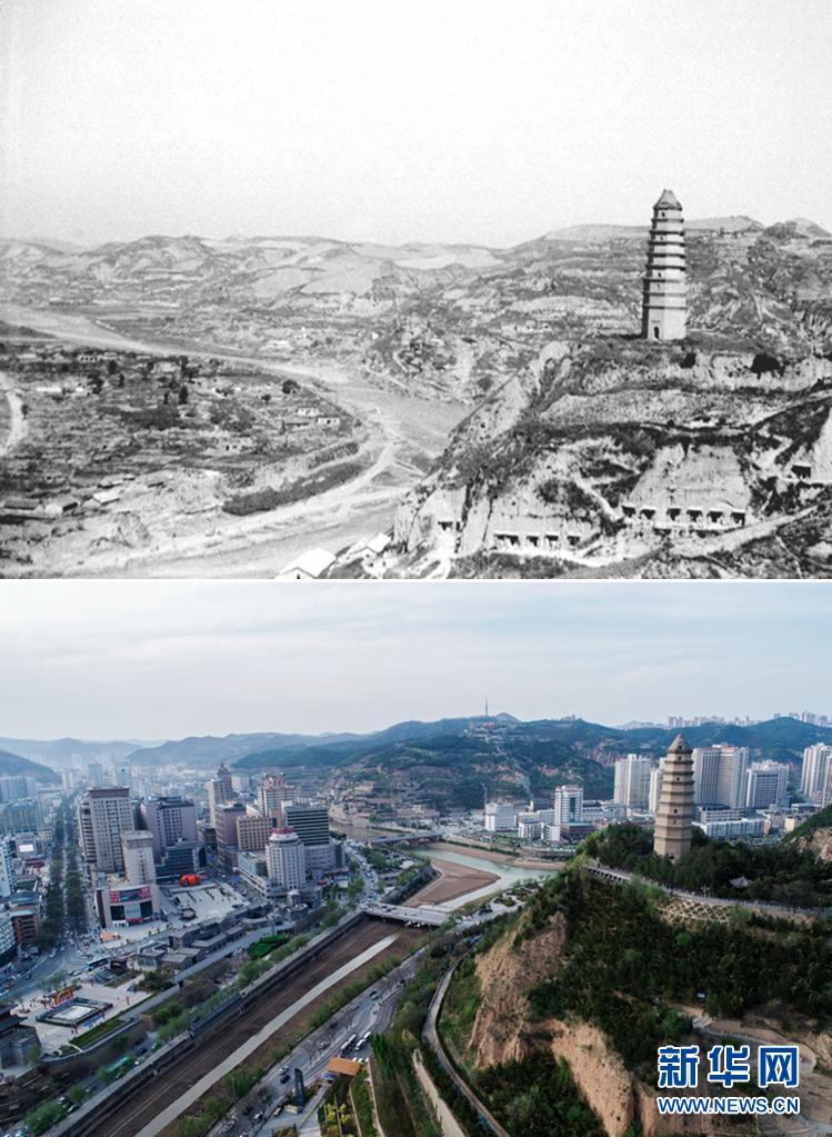 這是一張拼版照片,上圖為:1938年拍攝的延安(資料照片,新華社發(fā));下圖為:2021年4月22日拍攝的延安市(無人機(jī)照片,新華社記者張博文攝 )新華社發(fā)