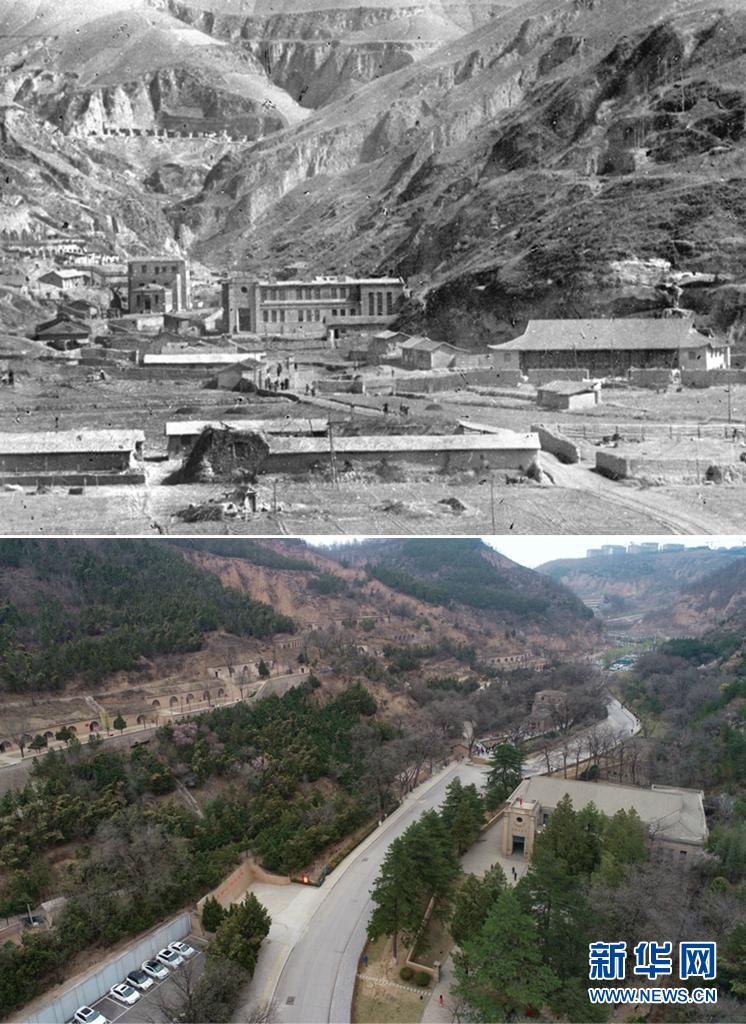 這是一張拼版照片,上圖為:1943年拍攝的延安楊家?guī)X——抗日戰(zhàn)爭時(shí)期黨中央所在地(吳印咸攝);下圖為:2021年4月21日拍攝的延安楊家?guī)X革命舊址(無人機(jī)照片,新華社記者張博文攝)。新華社發(fā)