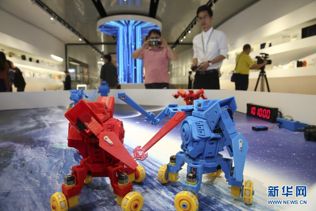 在廣東工業(yè)設(shè)計城創(chuàng)新科技館,工作人員在展示機器人“速斗無人區(qū)”(4月19日攝)。新華社記者 殷剛 攝