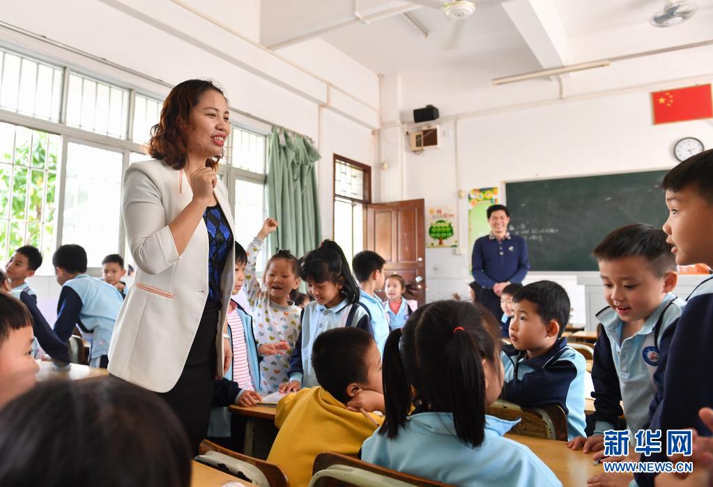 2019年2月20日,米雪梅(左)在中山市沙溪鎮(zhèn)虎遜小學(xué)調(diào)研時與小學(xué)生交流。新華社記者 劉大偉 攝
