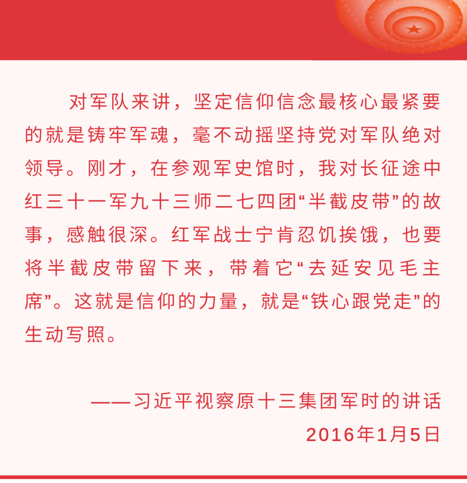 201615日,習(xí)主席視察原13集團(tuán)軍,當(dāng)聽到半截皮帶的故事時(shí),習(xí)主席深有感觸地說(shuō):這就是信仰的力量,就是鐵心跟黨走的生動(dòng)寫照。