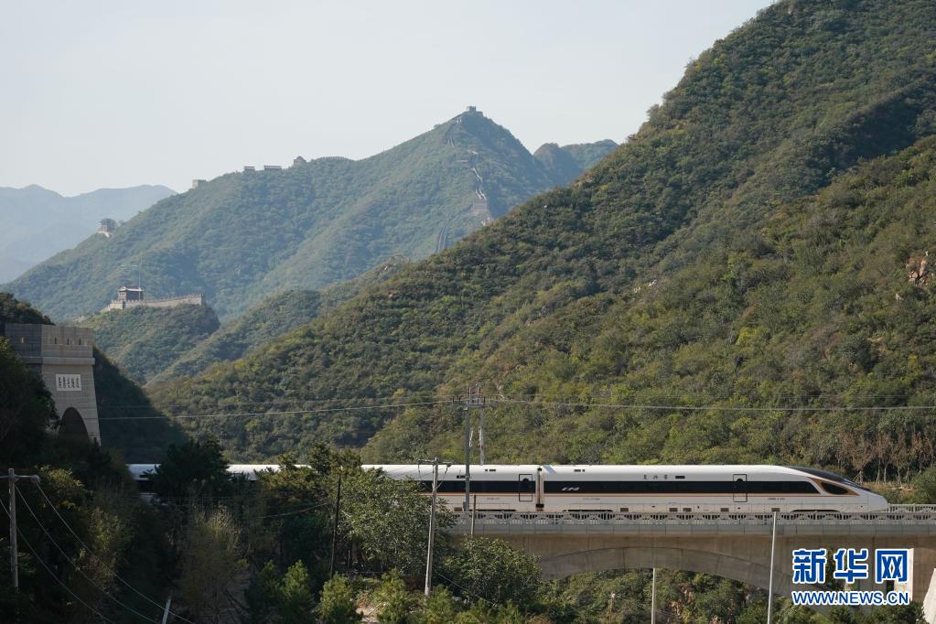 一列復(fù)興號(hào)高鐵列車從京張高鐵駛過居庸關(guān)長(zhǎng)城(2020年10月6日攝)。新華社記者 鞠煥宗 攝