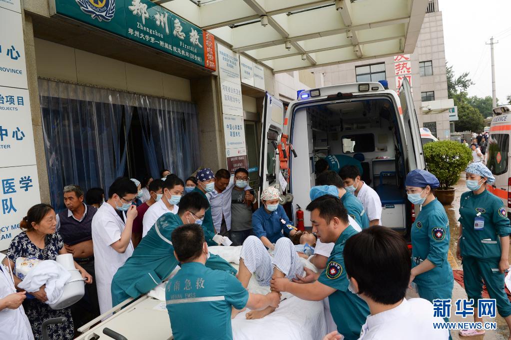 7月21日,鄭州大學(xué)第一附屬醫(yī)院河醫(yī)院區(qū)醫(yī)護人員幫助患者轉(zhuǎn)院。新華社記者 趙鵬 攝