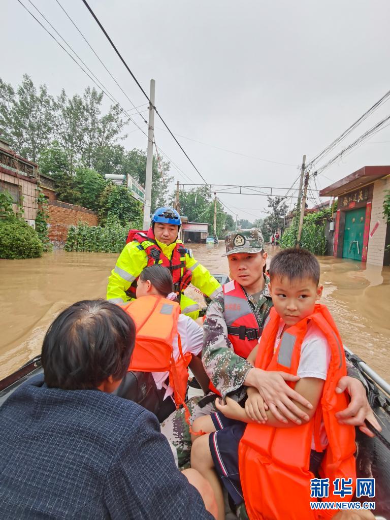 7月22日,河南新鄉(xiāng)長垣市人武部民兵乘沖鋒舟在衛(wèi)輝市牛廠村救助被洪水圍困群眾(手機拍攝)。新華社發(fā)(王升 攝)