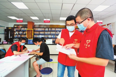 ?? 7月29日,鄭州市未來路街道金色港灣社區(qū),鄭州市大數(shù)據(jù)管理局工作人員與社區(qū)志愿者在統(tǒng)計(jì)居民受損情況。 本報(bào)記者 聶冬晗 攝