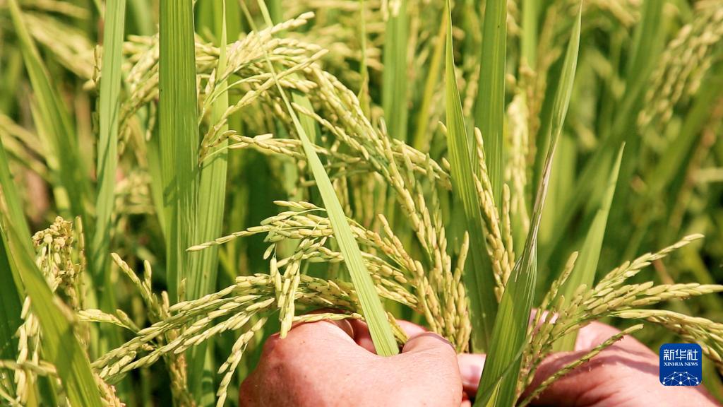 在湖南省汨羅市汨羅鎮(zhèn)江景村的稻田里,種糧大戶曾岳華查看優(yōu)質(zhì)稻“泰優(yōu)390”的結(jié)實(shí)率(9月17日攝)。新華社發(fā)(胡清 攝)