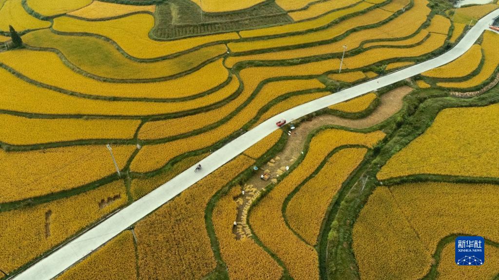 9月12日,農(nóng)民在貴州省龍里縣灣灘河鎮(zhèn)金批村稻田里收獲稻谷(無人機(jī)照片)。新華社發(fā)(龍毅 攝)