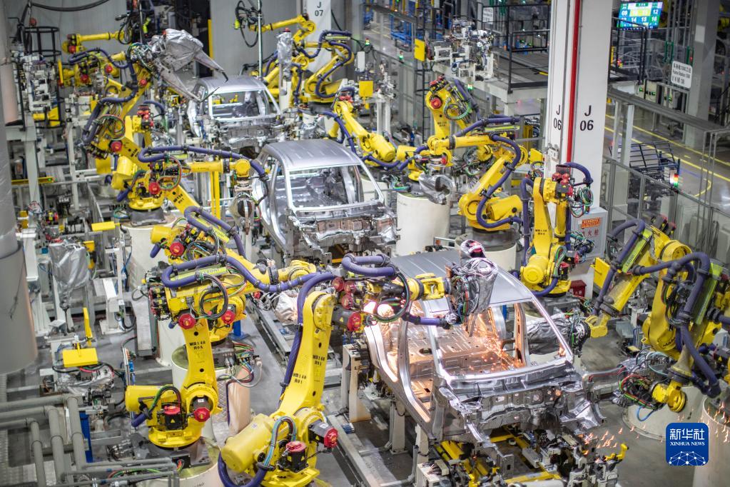 在重慶金康新能源汽車有限公司,智能化焊接機(jī)器人在進(jìn)行焊接作業(yè)(4月2日攝)。新華社記者 黃偉 攝