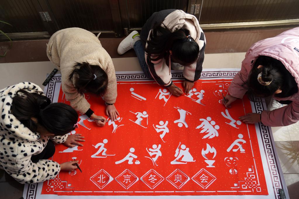 農(nóng)歷壬寅年到來之際,在河北省臨城縣東鎮(zhèn)鎮(zhèn)南孟村,村民圍繞“迎冬奧”主題剪紙。新華社發(fā)(陳雷攝)