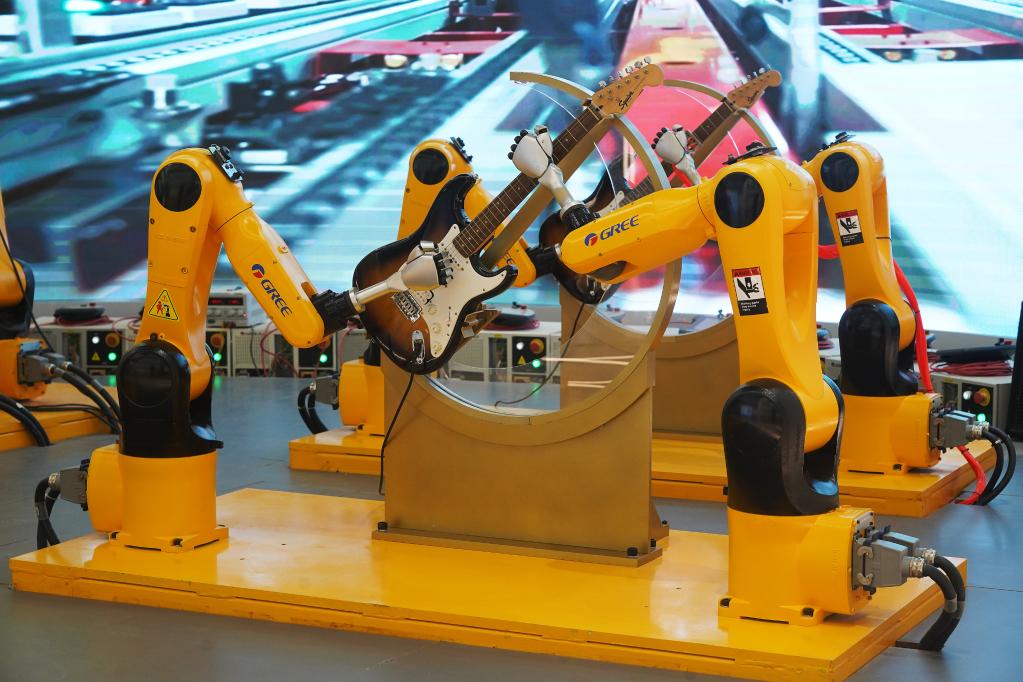 在位于贛州市的格力小鎮(zhèn),機(jī)器人樂隊(duì)正在演奏音樂(2月18日攝)。新華社記者萬象攝