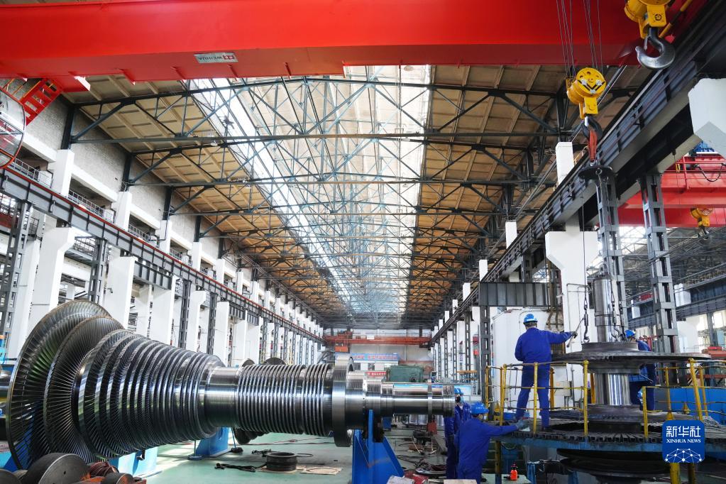 在哈電集團哈爾濱汽輪機廠有限責任公司生產(chǎn)車間,工人在生產(chǎn)作業(yè)(5月7日攝)。新華社記者 王建威 攝