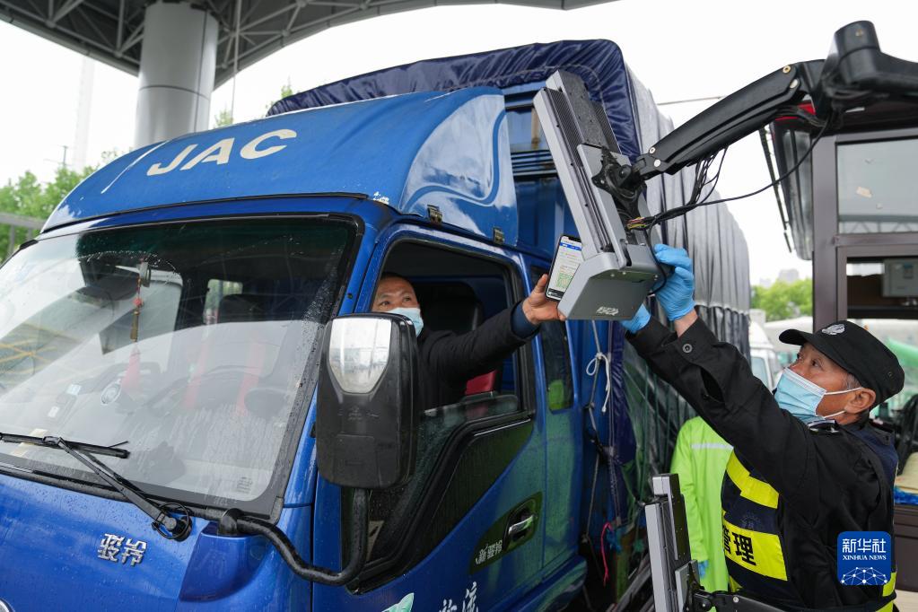 在安徽合肥百大周谷堆大興農(nóng)產(chǎn)品物流園,司機在智能化門禁系統(tǒng)上掃碼進入(4月13日攝)。該園建立集測溫、核驗安康碼、數(shù)據(jù)收集等功能的智能化門禁系統(tǒng),進場駕乘人員不用下車即可快速核驗,實現(xiàn)防疫測溫智能化、人車追溯數(shù)據(jù)化。新華社記者杜宇攝