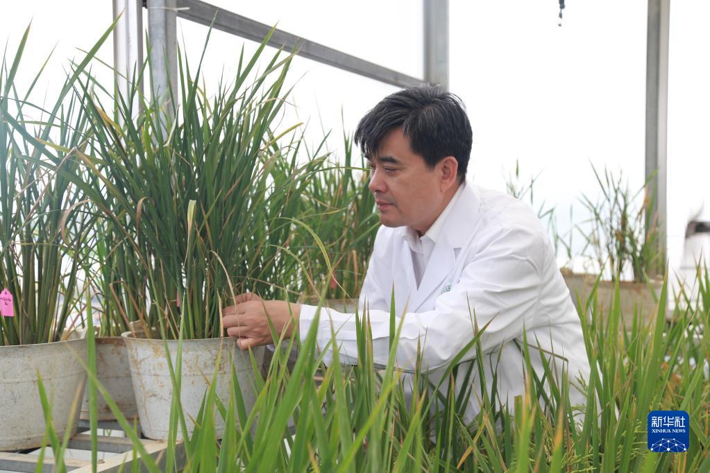 中國(guó)工程院院士、湖南省農(nóng)業(yè)科學(xué)院黨委書記柏連陽(yáng)在實(shí)驗(yàn)室查看水稻生長(zhǎng)情況(資料照片)。新華社發(fā)(受訪者供圖)