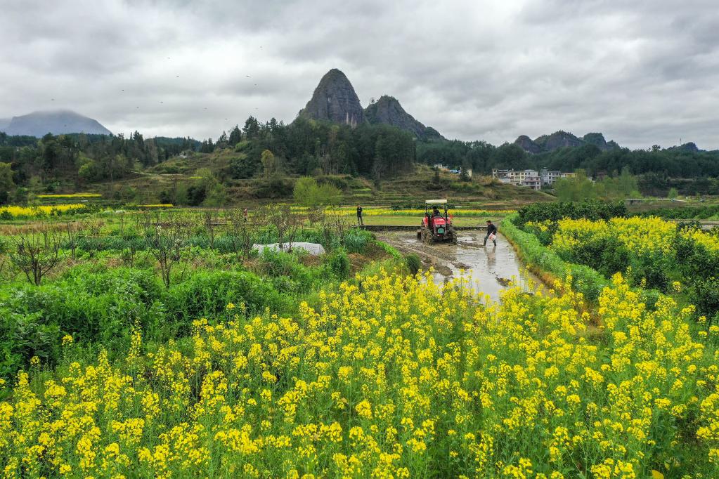 3月20日,湖南省湘西土家族苗族自治州龍山縣興隆街道,農(nóng)民在田間耕作(無(wú)人機(jī)照片)。新華社發(fā)(曾祥輝攝)