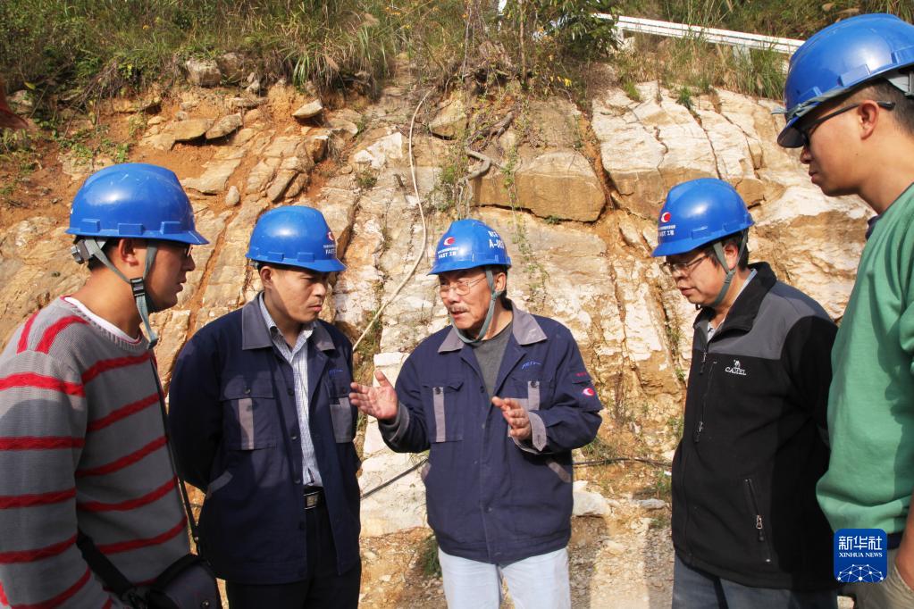 天文學(xué)家南仁東(中)與工程技術(shù)人員在大窩凼施工現(xiàn)場檢查施工進展(2014年12月1日攝)。新華社發(fā)(中科院國家天文臺供圖)