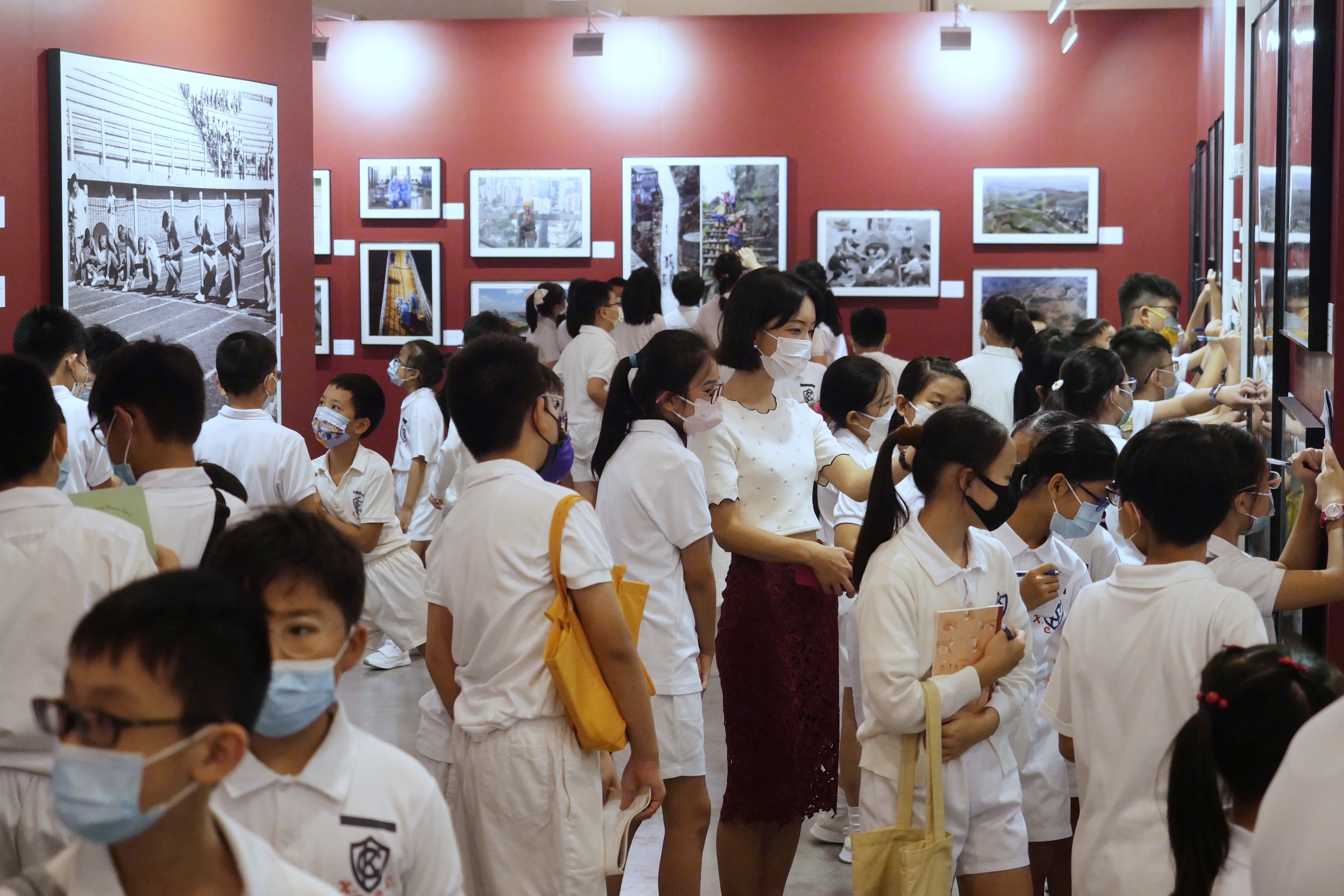 2021年10月11日,香港小學生在參觀《國家相冊》大型圖片典藏展。新華社記者 王申 攝