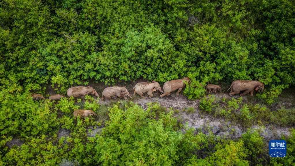 這是在云南省玉溪市元江縣境內(nèi)拍攝的象群(無人機(jī)照片,2021年8月9日攝)。新華社記者 胡超 攝