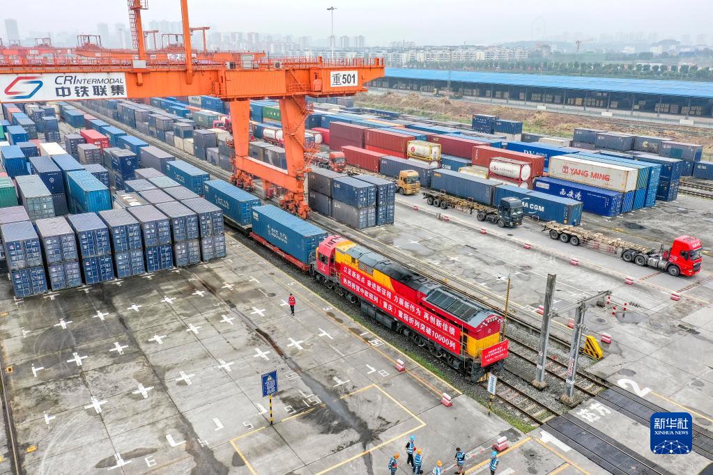 中歐班列(重慶)第10000列列車在重慶團(tuán)結(jié)村中心站等待發(fā)車(2022年6月23日攝,無人機(jī)照片)。新華社記者 黃偉 攝