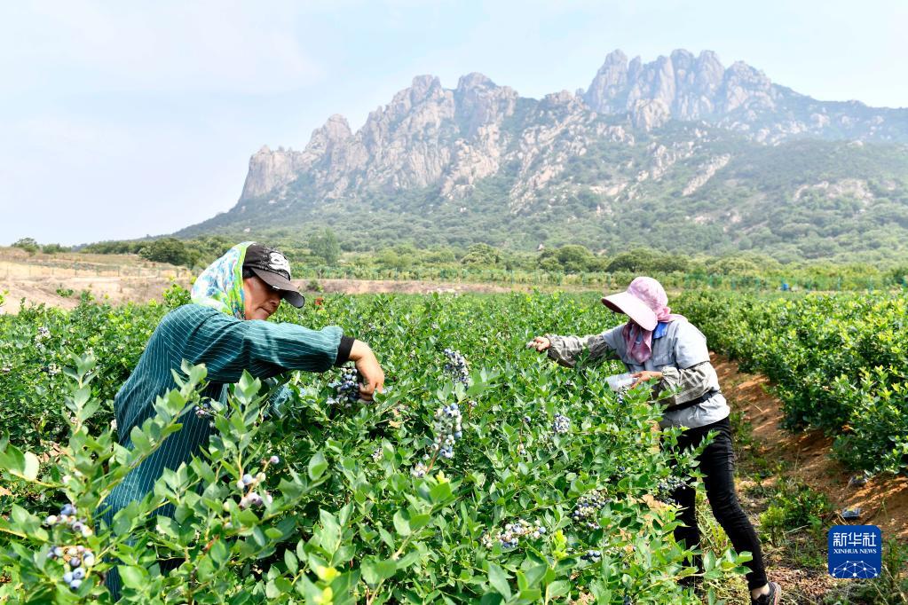 村民在山東省五蓮縣九五農(nóng)業(yè)現(xiàn)代林果科技產(chǎn)業(yè)園采摘藍(lán)莓(2022年6月18日攝)。新華社記者 郭緒雷 攝