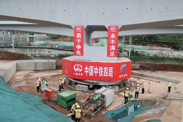 據(jù)悉,由中鐵四局承建的澠淅高速跨浩吉鐵路轉(zhuǎn)體梁全長140米,橋面寬13米,主墩高5米,是澠淅高速的控制性工程之一。該轉(zhuǎn)體梁是國內(nèi)為數(shù)不多的雙幅跨鐵路曲線梁,且距離鐵路線僅有8米,施工難度大,安全隱患多,安全卡控要求嚴(yán)。為實(shí)現(xiàn)精準(zhǔn)對(duì)接,項(xiàng)目部分別在2個(gè)T構(gòu)主墩安裝千斤頂和液壓泵,同步順時(shí)針轉(zhuǎn)體44.5°和42.3°。在歷經(jīng)正常轉(zhuǎn)動(dòng)、減速轉(zhuǎn)動(dòng)、點(diǎn)動(dòng)轉(zhuǎn)動(dòng)三個(gè)階段后,歷時(shí)100分鐘精確完成轉(zhuǎn)體。