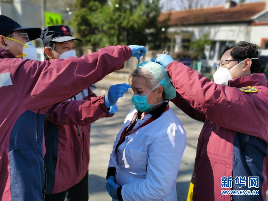 2020年4月4日,中國(guó)赴塞爾維亞抗疫醫(yī)療專家組在貝爾格萊德的基層發(fā)熱門診為門診主任特里富諾維奇(中)更換防護(hù)標(biāo)準(zhǔn)更高的口罩。新華社發(fā)