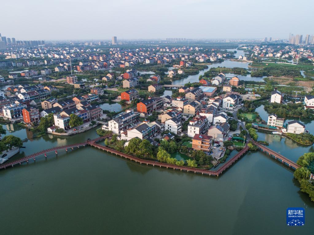 空中俯瞰杭州市余杭區(qū)塘棲古鎮(zhèn)丁山湖邊的水上棧道和丁河村(2019年8月7日攝,無(wú)人機(jī)照片)。新華社記者 徐昱 攝