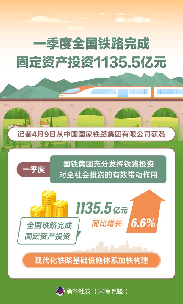 ?? 新華社北京4月9日電(記者樊曦)記者9日從中國國家鐵路集團(tuán)有限公司獲悉,一季度,國鐵集團(tuán)充分發(fā)揮鐵路投資對全社會投資的有效帶動作用,全國鐵路完成固定資產(chǎn)投資1135.5億元、同比增長6.6%,現(xiàn)代化鐵路基礎(chǔ)設(shè)施體系加快構(gòu)建。