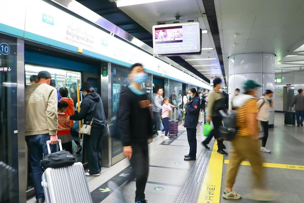 “大家進(jìn)站時要小心腳下的行李箱?!?日14時,隨著大量鐵路旅客抵達(dá)北京南站,地鐵4號線北京南站也開始變得忙碌。站廳內(nèi),工作人員在自動售票機(jī)、閘機(jī)前引導(dǎo)旅客快速購票進(jìn)站;站臺上,軌道列車準(zhǔn)時抵達(dá),乘客快速流動疏散。