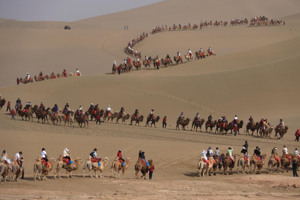 “2400多峰駱駝全部‘上崗’,從早到晚忙不過來!原本40分鐘的路程現(xiàn)在要走1小時左右。”敦煌鳴沙山月牙泉景區(qū)負責人說。