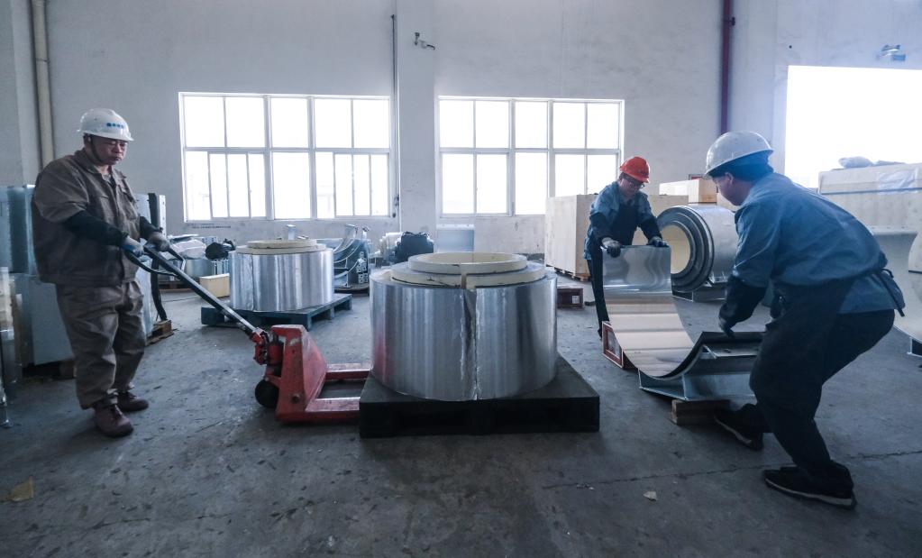 5月2日,在位于浙江省嘉興市秀洲區(qū)王店鎮(zhèn)的浙江振申絕熱科技股份有限公司聚氨酯車間內(nèi),工人進行管托安裝工序。新華社記者 徐昱 攝