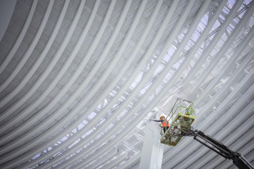 5月1日,在中建三局承建的武漢天河機場T2航站樓改造工程項目工地,工人檢查吊頂內(nèi)管線。新華社記者 伍志尊 攝