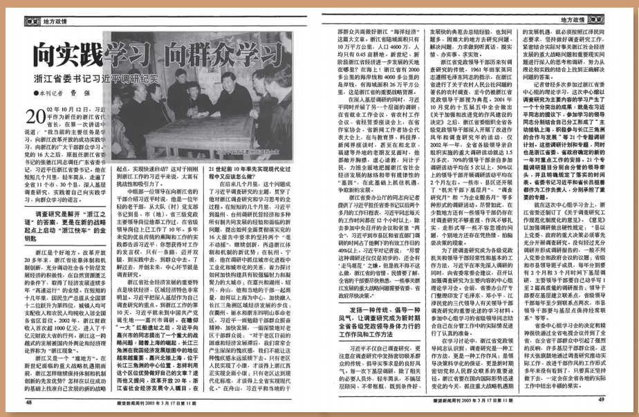 2003年3月,第10期、第11期《瞭望》連續(xù)刊發(fā)費強采寫的深度報道《浙江省委書記習(xí)近平:雙輪驅(qū)動提速發(fā)展》《向?qū)嵺`學(xué)習(xí)?向群眾學(xué)習(xí)——浙江省委書記習(xí)近平調(diào)研紀(jì)實》。4個月后,浙江省委十一屆四次全會提出了面向未來要進一步發(fā)揮八個方面的優(yōu)勢、推進八個方面的舉措,即“八八戰(zhàn)略”。其中的諸多提法,在《瞭望》的上述報道中已現(xiàn)雛形。