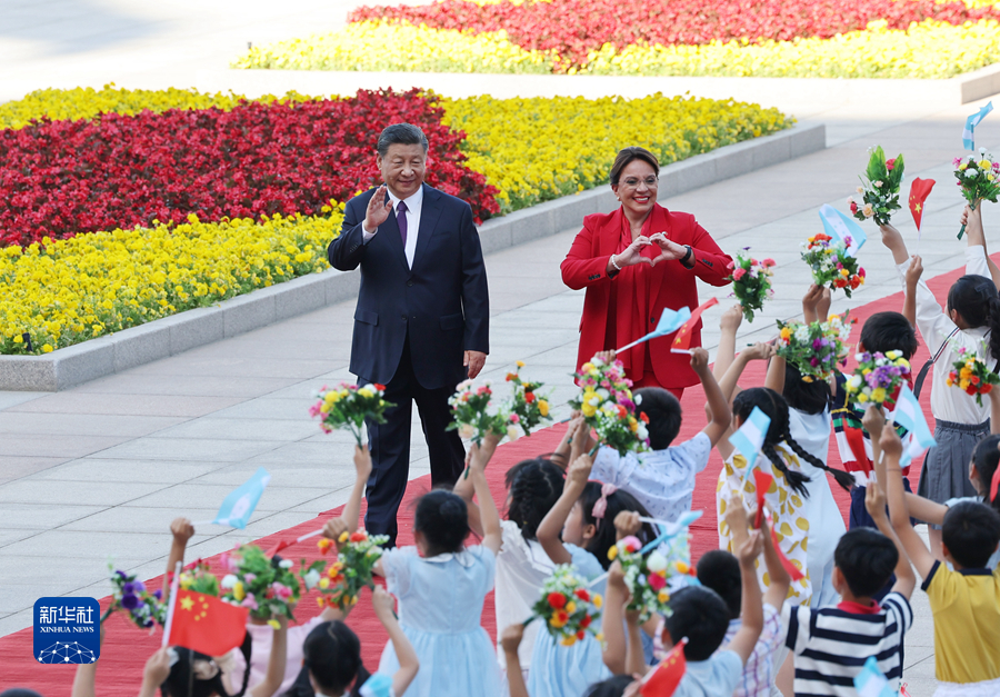 6月12日下午,國(guó)家主席習(xí)近平在北京人民大會(huì)堂同來(lái)華進(jìn)行國(guó)事訪問的洪都拉斯總統(tǒng)卡斯特羅舉行會(huì)談。這是會(huì)談前,習(xí)近平在人民大會(huì)堂東門外廣場(chǎng)為卡斯特羅舉行歡迎儀式。新華社記者 黃敬文 攝