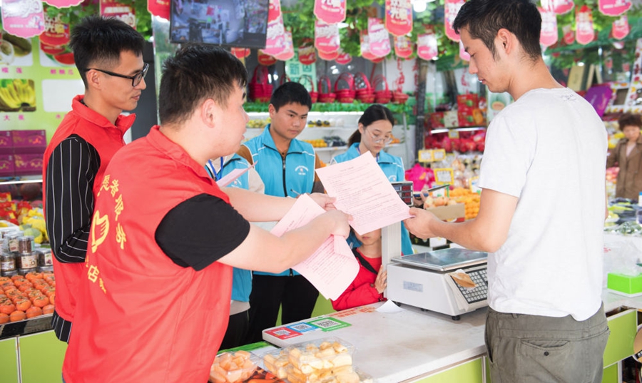 浙江省湖州市吳興區(qū)八里店鎮(zhèn)結(jié)合主題教育和“三服務(wù)”,推進“民生大走訪”工作機制,全體網(wǎng)格員下沉村、社一線,了解社情民意,化解矛盾糾紛,服務(wù)村社群眾。這是八里店鎮(zhèn)中心片區(qū)網(wǎng)格員(藍(lán)衣者)和志愿者(紅衣者)對一家店鋪進行平安問卷調(diào)查(2019年10月31日攝)。新華社記者 翁忻旸 攝