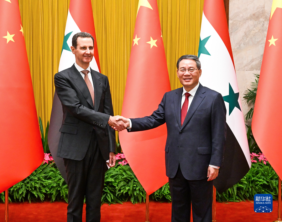 9月25日上午,國務(wù)院總理李強(qiáng)在北京人民大會堂會見來華出席杭州第十九屆亞洲運(yùn)動會開幕式的敘利亞總統(tǒng)巴沙爾。新華社記者 饒愛民 攝