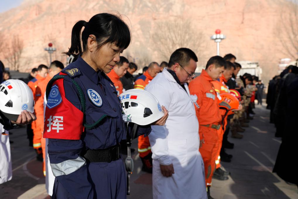 12月25日,在積石山縣大河家鎮(zhèn)大河文化廣場(chǎng),參加悼念活動(dòng)的人員為遇難同胞默哀。 新華社記者 方欣 攝