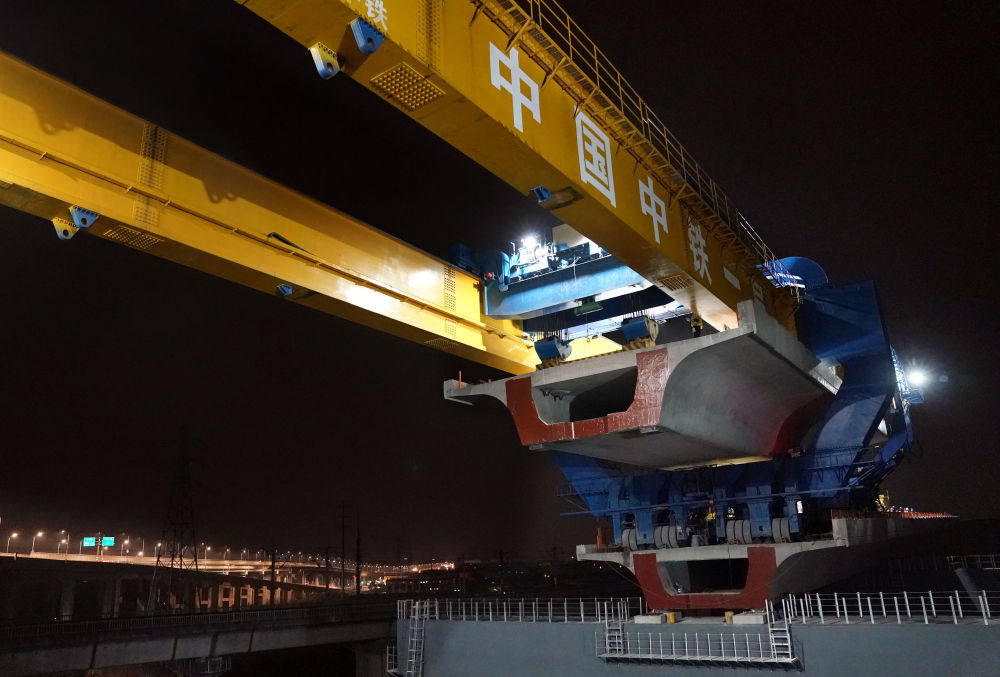 ??這是2024年3月4日凌晨拍攝的滬蘇湖鐵路全線最后一榀箱梁架設(shè)施工現(xiàn)場。當日,滬蘇湖鐵路全線箱梁架設(shè)完成。