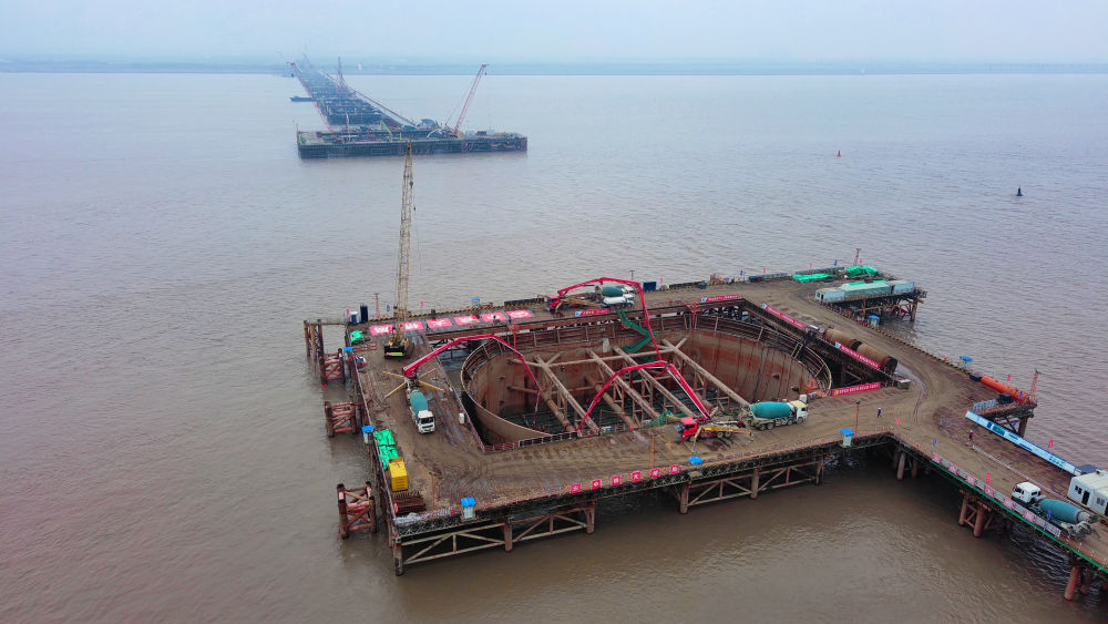 ??2024年3月27日,在江蘇啟東長江入??诒敝Ш降澜媸┕がF(xiàn)場,上海至南京至合肥高鐵控制性節(jié)點工程——崇啟公鐵長江大橋3、4號主墩承臺首次澆筑完成。