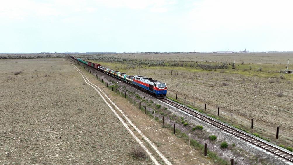 ??2023年5月12日,在哈薩克斯坦阿拉木圖附近,貨運(yùn)列車馳騁于阿拉木圖與中國(guó)霍爾果斯間(無人機(jī)照片)。新華社發(fā)(奧斯帕諾夫攝)