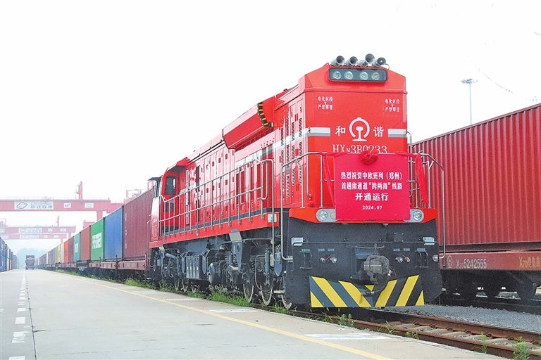 這趟班列踏上的是一條新征程,標(biāo)志著中歐班列(鄭州)南通道“跨兩海”線路開(kāi)通運(yùn)行。