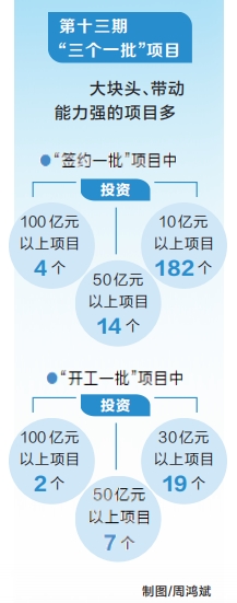 分析第十三期“三個(gè)一批”項(xiàng)目,從投資額度看,大塊頭、帶動(dòng)能力強(qiáng)的項(xiàng)目多。本期活動(dòng)“簽約一批”項(xiàng)目中投資100億元以上項(xiàng)目4個(gè)、50億元以上項(xiàng)目14個(gè)、10億元以上項(xiàng)目182個(gè);“開工一批”項(xiàng)目中投資100億元以上項(xiàng)目2個(gè)、50億元以上項(xiàng)目7個(gè)、30億元以上項(xiàng)目19個(gè)。