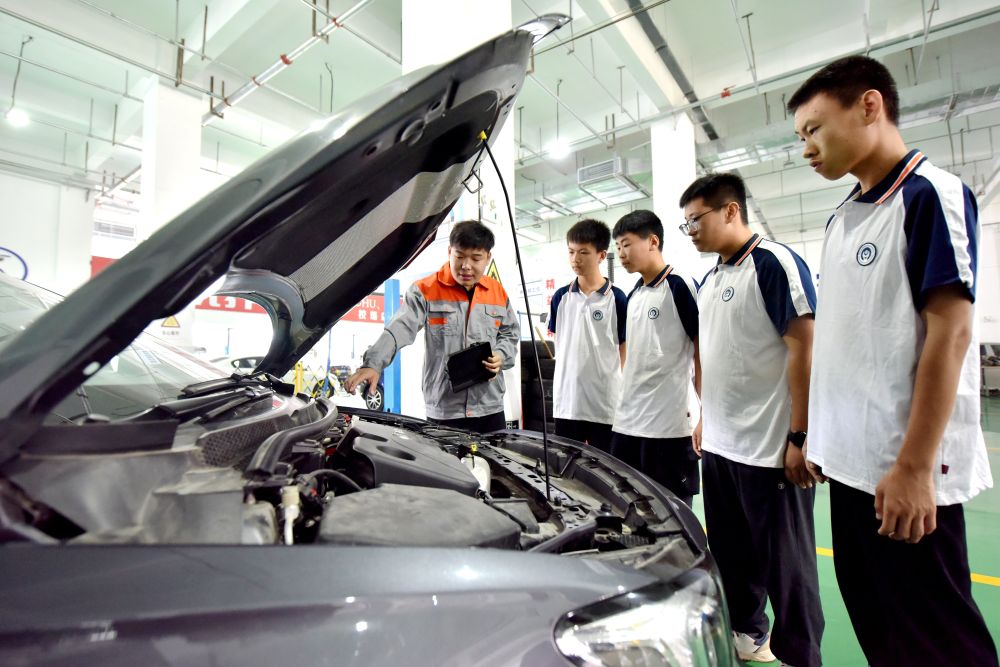 ??2024年6月7日,河北省邢臺(tái)市威縣職業(yè)技術(shù)教育中心教師在指導(dǎo)學(xué)生學(xué)習(xí)汽車維修技術(shù)。新華社記者 王曉 攝