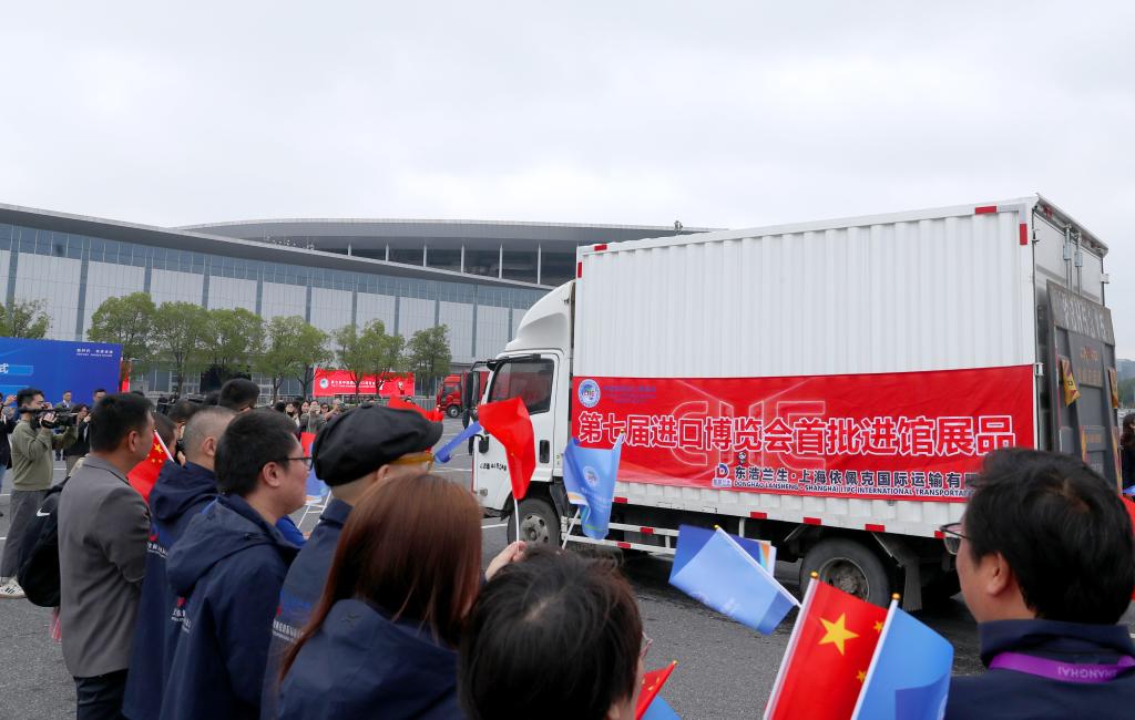 ??10月22日,裝載首批進館展品的卡車駛?cè)雰x式現(xiàn)場。當日,第七屆中國國際進口博覽會首批展品進館儀式在國家會展中心(上海)舉行。新華社記者方喆攝