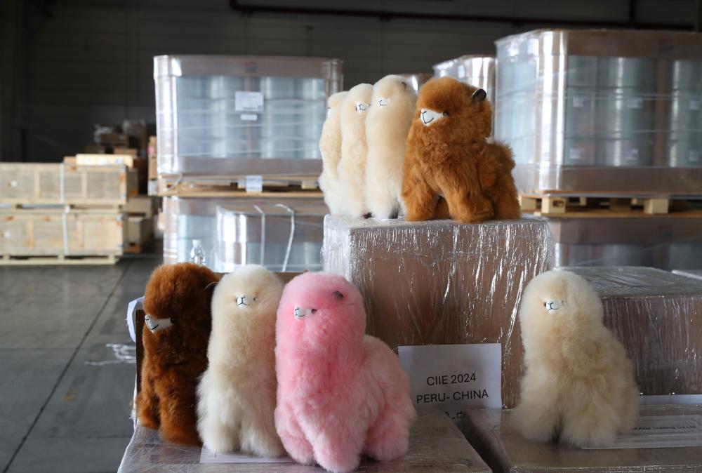??10月14日拍攝的運抵中遠海運自有倉庫的“溫暖駝”產(chǎn)品。當日,中遠海運承運的第七屆進博會海運首單展品秘魯“溫暖駝”系列產(chǎn)品由洋山港碼頭運抵中遠海運自有倉庫,隨后改換短駁廂式車送往客戶公司。新華社記者方喆攝