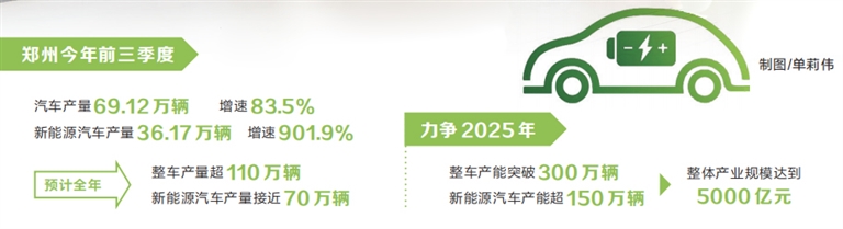 “今年前三季度,鄭州汽車產(chǎn)量69.12萬輛、增速83.5%,新能源汽車產(chǎn)量36.17萬輛、增速901.9%。預(yù)計(jì)全年整車產(chǎn)量超110萬輛,新能源汽車產(chǎn)量接近70萬輛?!编嵵菔姓嚓P(guān)負(fù)責(zé)人表示,鄭州正在加快建設(shè)全國重要的新能源及智能網(wǎng)聯(lián)汽車研發(fā)和生產(chǎn)基地,力爭2025年整車產(chǎn)能突破300萬輛、新能源汽車產(chǎn)能超150萬輛,整體產(chǎn)業(yè)規(guī)模達(dá)到5000億元。